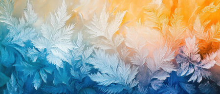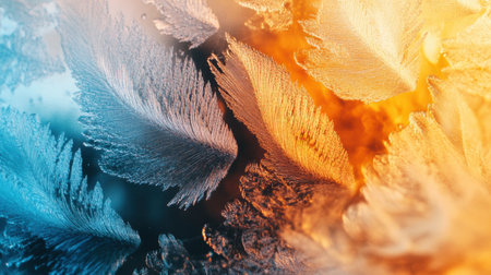 Intricate frosty patterns emerge, showing a stunning contrast of cool blue and warm orange tones created by freezing temperatures.