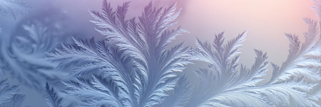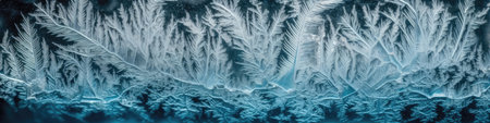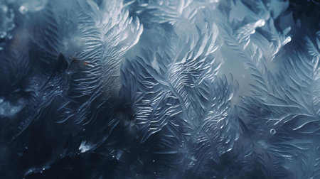 A creative digital illustration depicting Artistic background design of frost crystal growth on window in icy whites, fractal branches, winter crisp mood, cold blue tinted lighting. This AI-generated artwork features unique visual elements suitable for various commercial and editorial applications. AI-generated illustration.