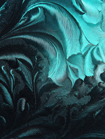 Detailed frost patterns create a mesmerizing texture on a cool window surface in blue