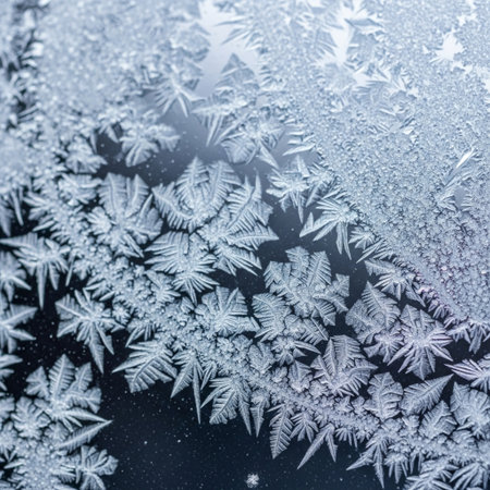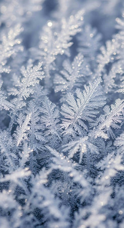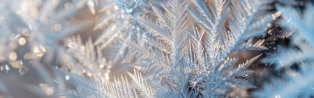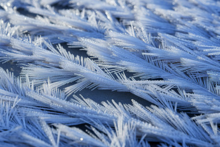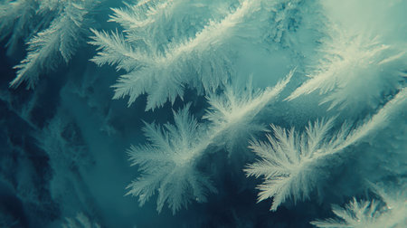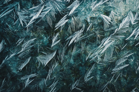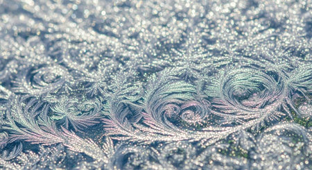 This stunning close-up image captures the intricate beauty of frost-covered ice crystals, showcasing delicate patterns that emerge in winter's chill.