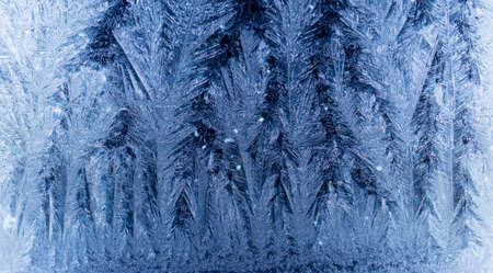 Beautiful blue frost patterns on frozen window as a symbol of Christmas wonder. Christmas or New year background.