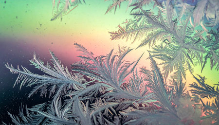 Macro view of intricate frost patterns resembling snowflakes on a dark surface with a color gradient.