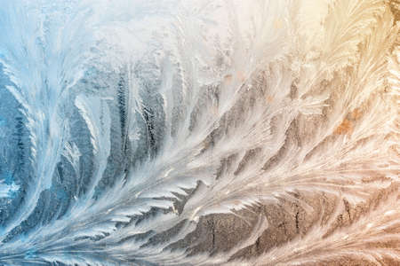 Frosty natural pattern on winter window glass at sunrise. Abstract background.