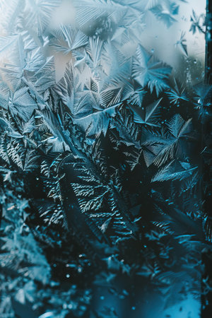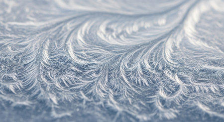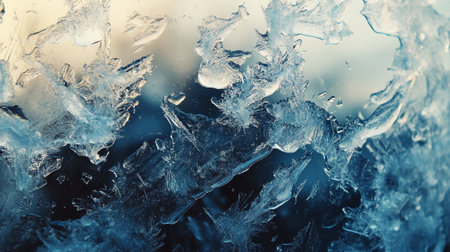 Intricate ice crystal formations on frozen windowpane, abstract macro photography, cold morning light.