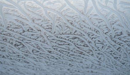 Delicate frost patterns cover the surface of glass, showing intricate designs formed by nature on a cold winter morning in a quiet setting.