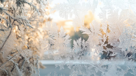 Delicate frost crystals cover a window, creating intricate designs. The soft light of dawn adds a warm glow, enhancing the beauty of the frozen landscape.
