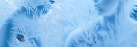 abstract winter background with frosty patterns and contours of bodies behind glass