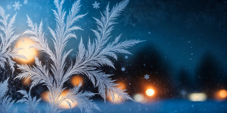 Close-up of frost patterns on glass with soft light in the background, copy space.