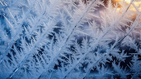 Closeup of delicate frost patterns on a windowpane at sunrise