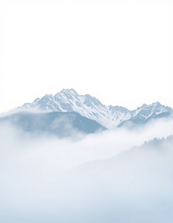 A stunning view of a snow-capped mountain rising majestically above a misty forest, capturing the serene beauty of nature at dawn. The peaceful landscape invites exploration and adventure.