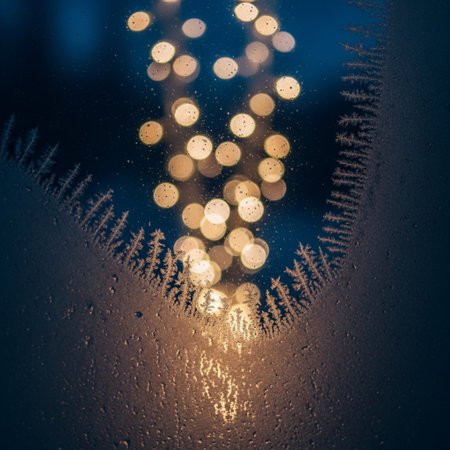A serene scene featuring frosted glass adorned with delicate patterns, revealing soft, warm lights in the background, evoking a comforting winter ambiance.