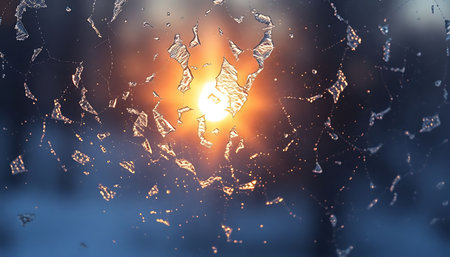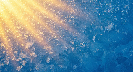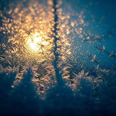 A close-up view of intricate frost patterns on a window, illuminated by the warm glow of the rising sun on a winter morning, creating stunning visuals.