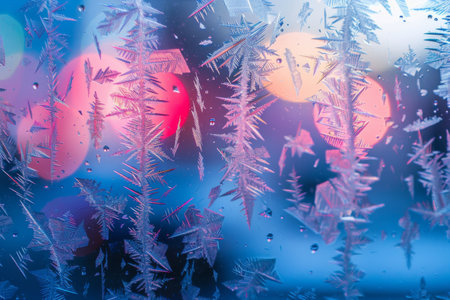 Abstract frost texture on window with bokeh lights. Freezing winter pattern creates seasonal decoration background design.