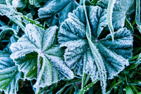 Green leaves covered with hoarfrost in the morning. Natural background
