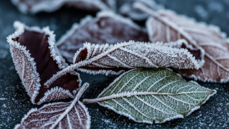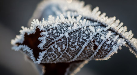 AI Generated. A mesmerizing macro perspective of frozen nature showcasing the delicate beauty of frost covered leaves