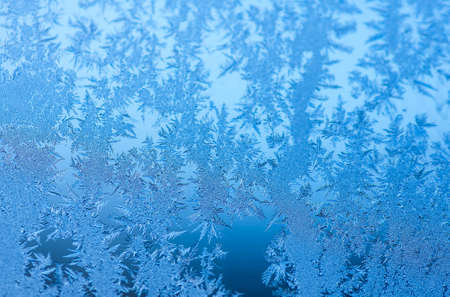 Frosty natural pattern on frozen window glass. Winter background.