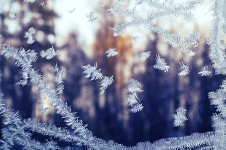 Frosty snowflake pattern on a winter window, outside the forest at sunset.