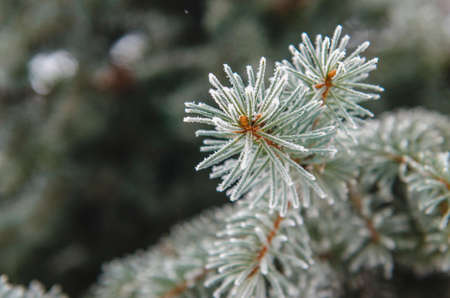 Fir tree branch covered with hoarfrost, close-up.