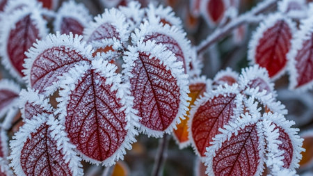 A stunning close-up of frost-covered leaves in winter, capturing the intricate details of nature's artistry and the glimmer of ice. This photograph showcases the serene beauty of a cold morning and the elegance of frozen flora. Perfect for seasonal themes.