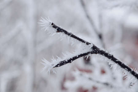 beautiful winter natural backdrop hoarfrost on a tree branch