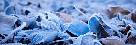 Frost-covered blue leaves in autumn, close-up view. Seasonal nature and texture concept