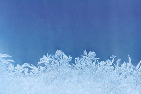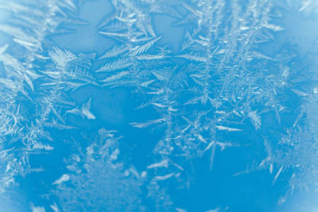 Blue background with frozen snowflakes on the glass. Frost on glass on a frosty morning. Christmas and new year.