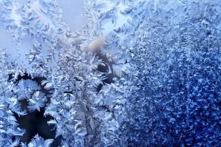 Blue frosty pattern on window glass, winter background