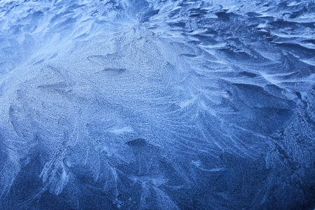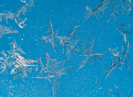 Frosty pattern on the deep blue window glass as background