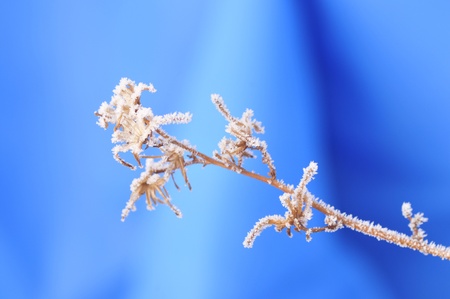 On a cold winter day, the delicate stems of wildflowers are covered with snow and frost. It's cold outside. Background.