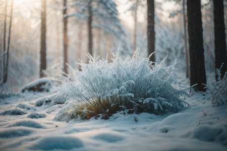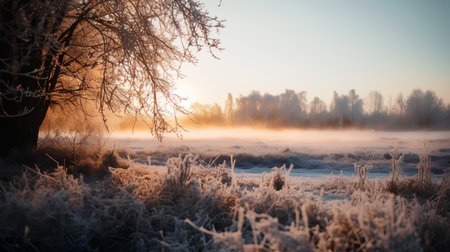 Frosty grass glistens in the early morning sunlight at a serene winter landscape
