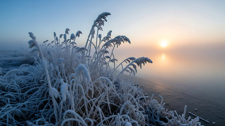 Delicate ice crystals cover tall grass and reeds on the edge of a frozen lake as the morning sun rises through the mist.