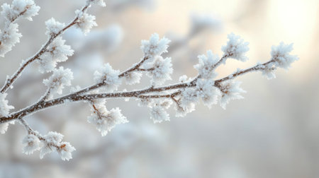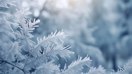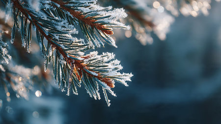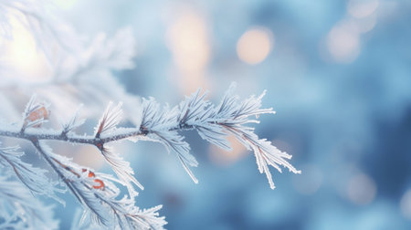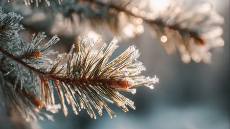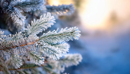 Close up of a pine tree branch covered in delicate hoarfrost crystals, creating a beautiful winter scene with a soft, dreamy background, ideal for christmas or winter themed projects