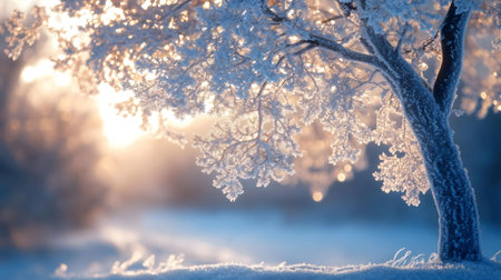 A frosty tree bathed in the warm glow of sunrise, a winter wonderland scene.