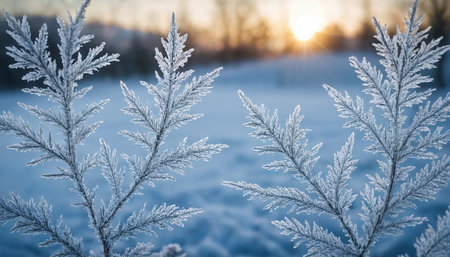 A beautiful winter morning scene showcasing frosty plants illuminated by the soft glow of sunrise. The icy details create a serene atmosphere, highlighting nature's beauty.