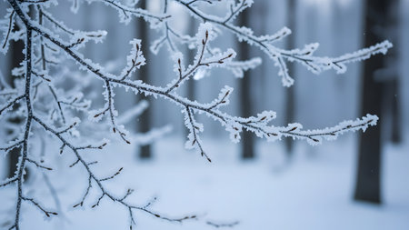 Delicate branches adorned with frost stretch into a soft icy blue atmosphere. The cold enhances the serene beauty of winter, capturing a tranquil moment in nature.
