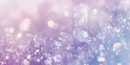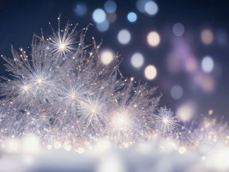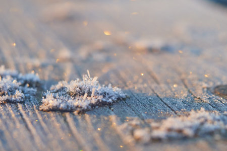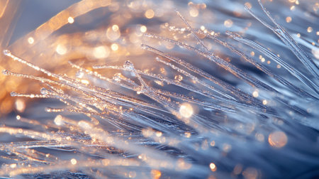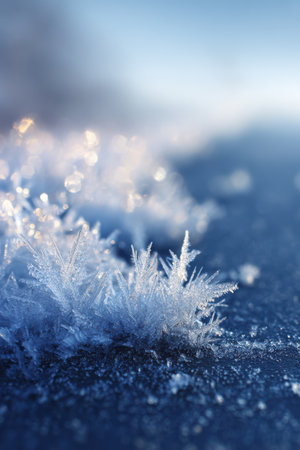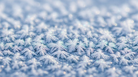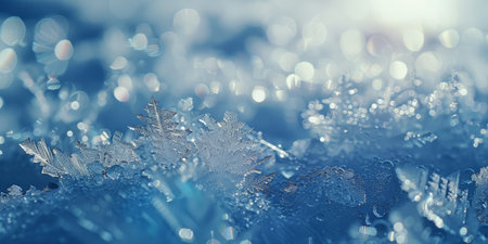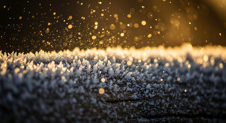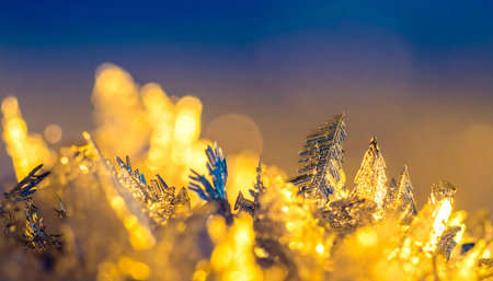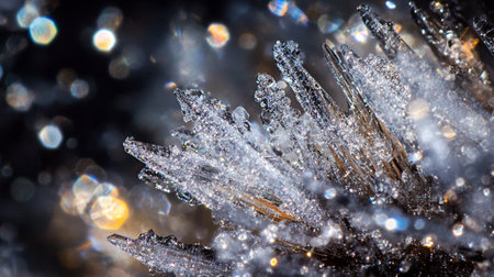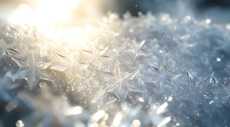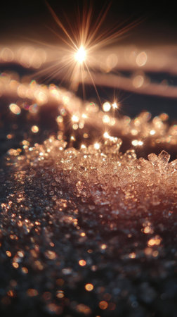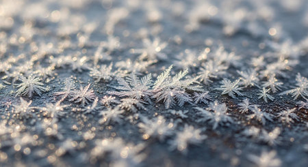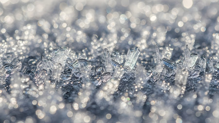 Macro view of intricate ice crystals sparkling on a surface with soft sunlight and bokeh
