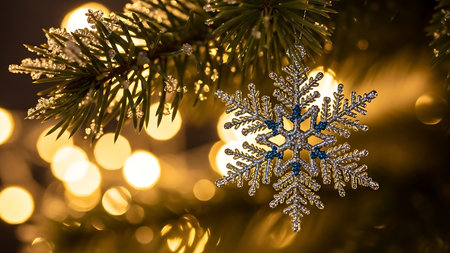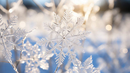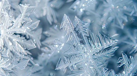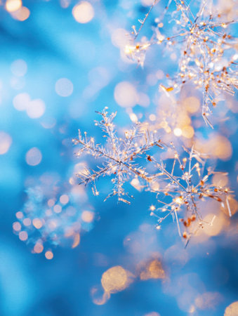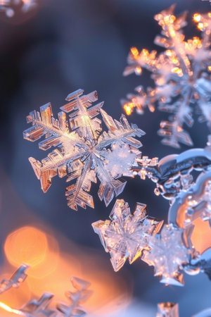 Delicate, intricate snowflake crystals with frosty details in a soft winter glow, highlighting the beauty of natural ice formations.