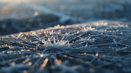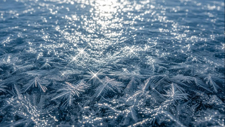 Close-up of ice crystals forming intricate patterns, illuminated by sunlight. A serene winter scene.