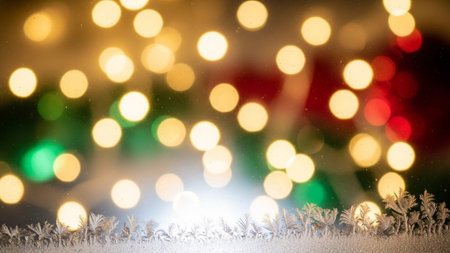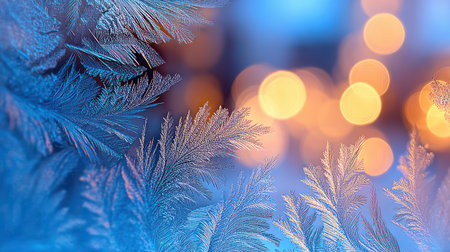 Detailed frost formations spread across a surface with warm blurred bokeh lights in the backdrop.