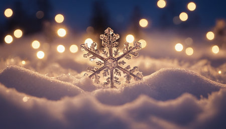 Macro photograph of a single, intricate snowflake surrounded by frosty crystals and soft bokeh lights.