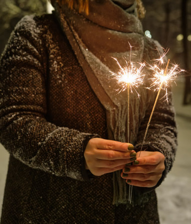 A woman lights sparklers against the background of a Christmas tree decorated for the holiday. Celebrating winter holidays