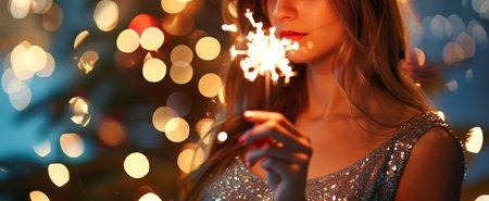 Woman holding a sparkling sparkler in a festive setting. Concept of celebration, holiday, evening gown, party atmosphere, Christmas, New Year.