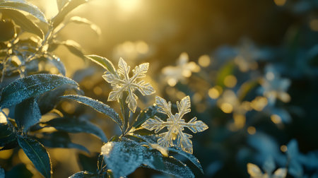 A Delicate flowers covered in frost sparkle under the soft light of a winter morning.