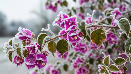 Bougainvillea flowers covered with hoarfrost in winter