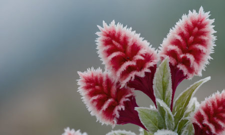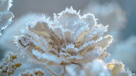 Close-up of beautiful frost-kissed flowers with intricate ice crystals, showcasing nature's delicate beauty in a cold winter morning. Soft bokeh background enhances the serene atmosphere.
