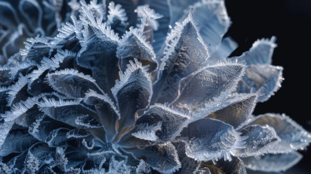 The intricate details of a frost flower captured up close with its delicate s and edges glistening in a frosty coating