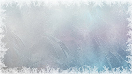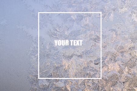 Ice patterns on winter glass of window, with the light seen through it. Horizontal with white frame with words Your text. Creative background about winter, cold, christmas time. Selective focus.