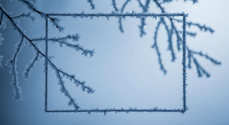 Close-up of two delicate frost-covered branches against a serene blue background. Winter wonderland vibes.