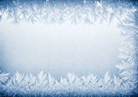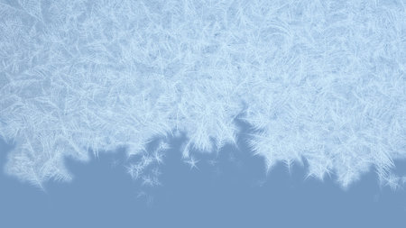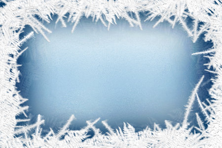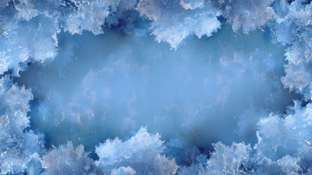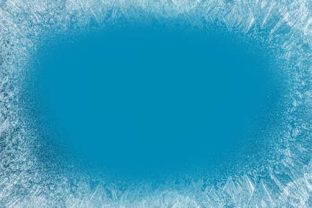 Blue ice crystals forming frame on frozen surface. Macro of snowflakes and frostwork for holiday or new year design