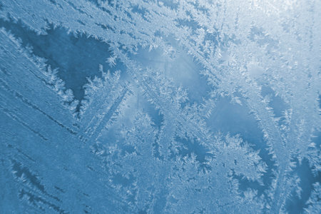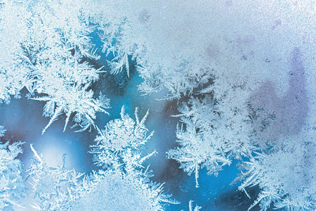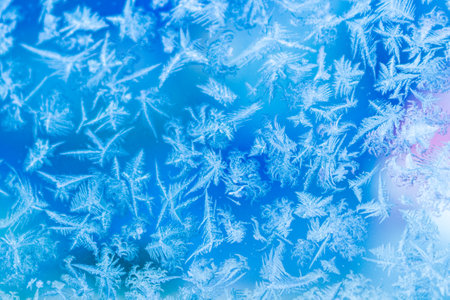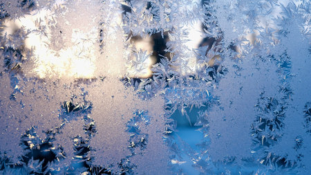 Close-up pattern of intricate frost patterns on a windowpane. Delicate crystalline ice formations, known as frost flowers, created by deposition in cold winter conditions